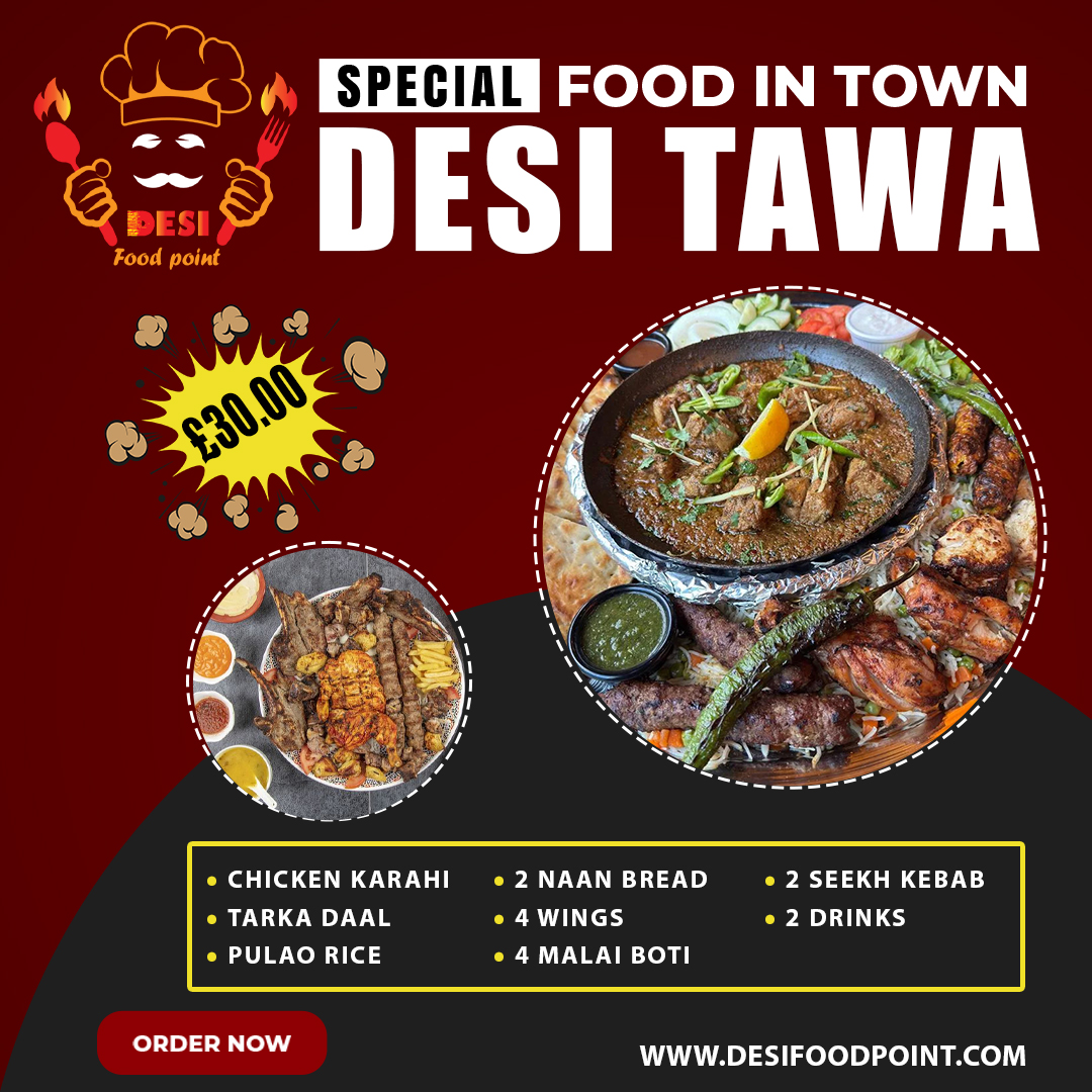 chicken karahi, tarka daal, pulao rice, 2 naan bread, 4 wings, 4 malai boti, 2 seekh kebab, 2 drinks